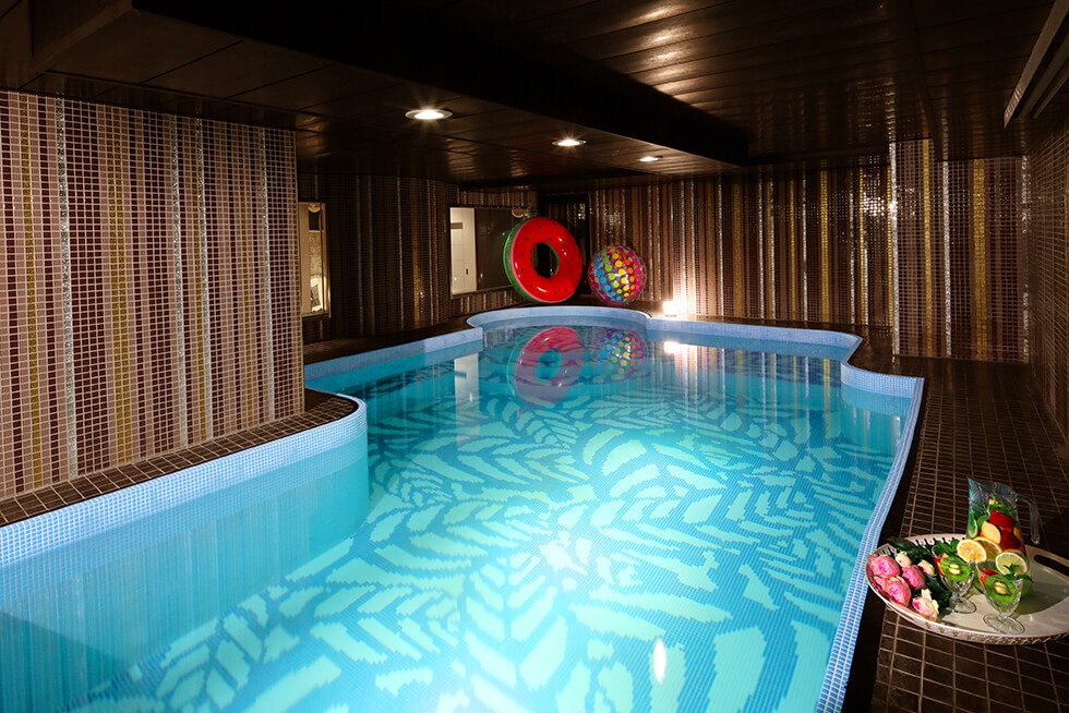 Dランク ラグジュアリー 702 ベッドルーム リビングベッドルーム ソファ ブロアバス 洗面化粧台 アメニティ アメニティ ティーセット お部屋の設備 プール ブロアバス 22インチ浴室TV 水中照明 空気清浄機 持込用冷蔵庫 電子レンジ ウォシュレット ドライヤー ティーセット